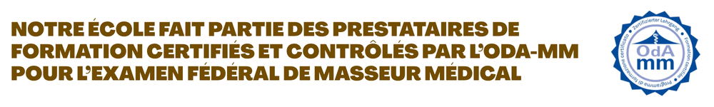Cette école se distingue en Suisse romande par le fait qu’elle est partenaire de formation de l’ODA-MM comme centre de formation pour la préparation aux examens du brevet fédéral de masseur médical et par son taux de réussite de plus de 95% aux examens du brevet fédéral de masseur médical.
